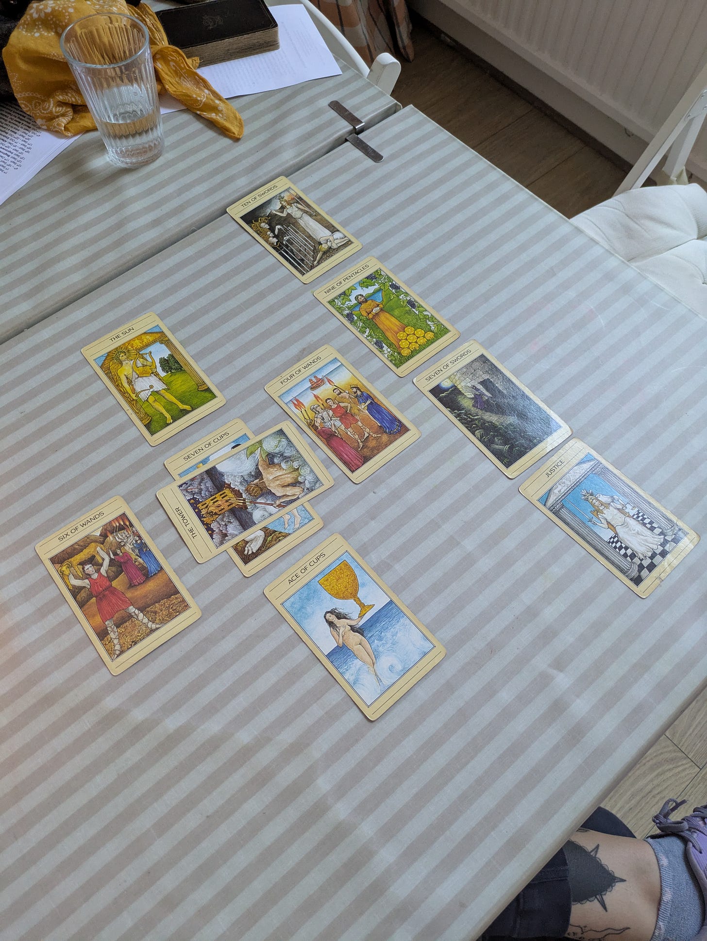 According to Clarissa, I’m approaching a big change in my life, and while The Tower card may seem daunting and devastating (well, it’s a tumbling mass of sturdy stonework amidst a storm, so!?) it’s actually a necessary ‘falling away’ of what needs to be removed in order to build new foundations. The Seven of Cups indicates that I have more options available to me than I realise. These two are the core, the beginning of it all. There’s no clear timeline, but apparently some things are still a way off — peer support and mythical tribe-finding, something I’ve never quite been able to achieve in my working life, peace-making in times of stress and collecting the abundance I’m owed, deepening of relationships and carving a new romantic path, finding balance (what’s that?) and looking upwards to the Sun’s warm encouraging glow… it’s all very positive, as she said. I want to seize it with both hands, but I’m still anxiously sprinkling a pinch of salt over one shoulder and forcing myself to remember what came before, before I wonder any more on what has yet to be.